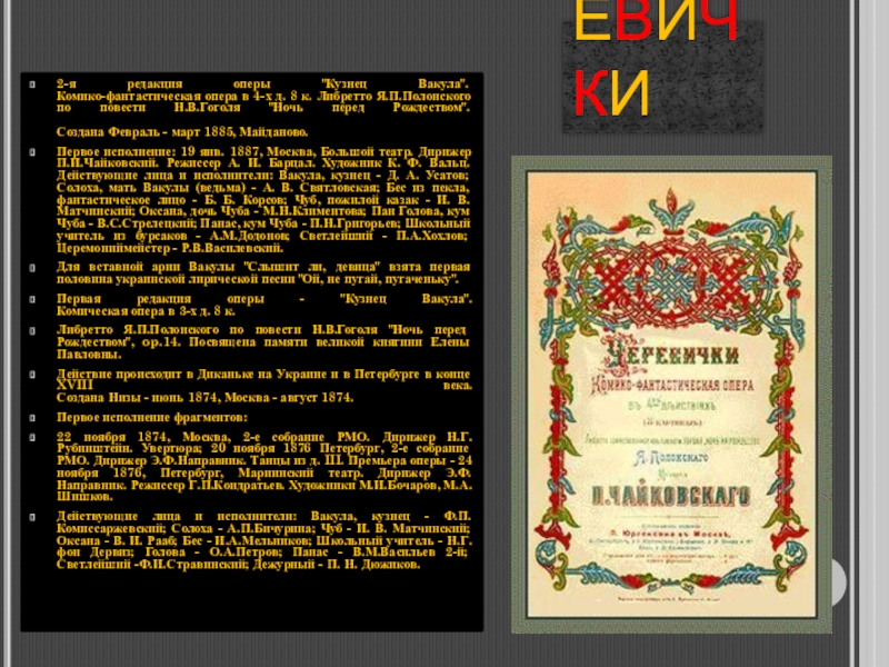 Либретто Я.П.Полонского по повести Н.В.Гоголя "Ночь перед Рождеством".