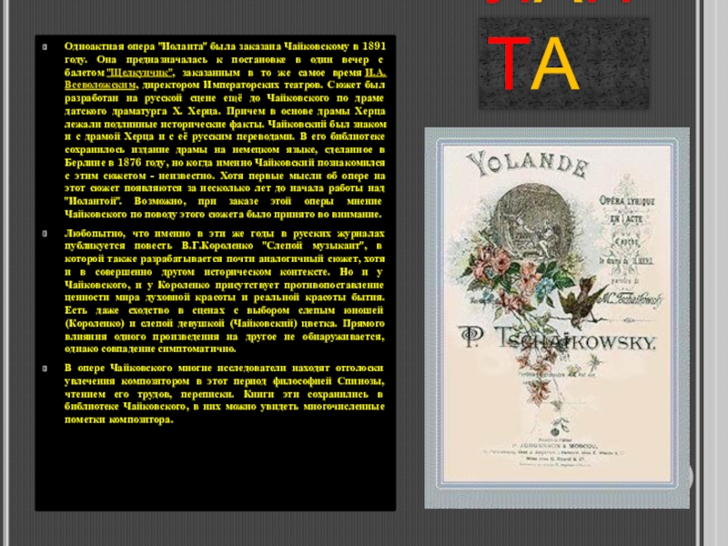 к постановке в один вечер с балетом "Щелкунчик", заказанным в то же самое время И.А.Всеволожским, директором Императорских театров. Сюжет был разработан на русской сцене ещё до Чайковского по драме датского драматурга Х. Херца. Причем в основе драмы Херца лежали подлинные исторические факты. Чайковский был знаком и с драмой Херца и с её русским переводами. В его библиотеке сохранилось издание драмы на немецком языке, сделанное в Берлине в 1876 году, но когда именно Чайковский познакомился с этим сюжетом - неизвестно. Хотя первые мысли об опере на этот сюжет появляются за несколько лет до начала работы над "Иолантой". Возможно, при заказе этой оперы мнение Чайковского по поводу этого сюжета было принято во внимание.