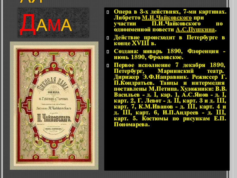 Опера в 3-х действиях, 7-ми картинах. Либретто М.И.Чайковского при участии П.И.Чайковского по