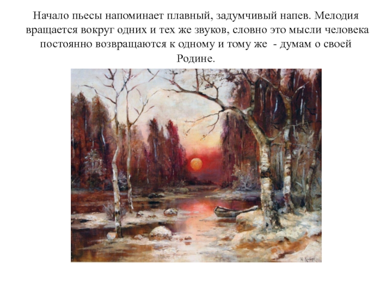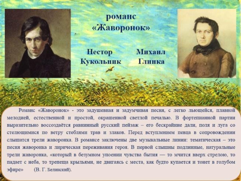 Жаворонок – первая весенняя птичка, её прилёт знаменует начало тёплой поры. Поэтому Глинка передаёт своей музыкой радостное настроение, которое охватывает человека оттого, что наконец пришло время проститься с зимой и встретить весну!
