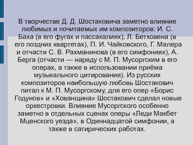 композиторов: И. С. Баха (в его фугах и пассакалиях), Л. Бетховена (в его поздних квартетах), П. И. Чайковского, Г. Малера и отчасти С. В. Рахманинова (в его симфониях), А. Берга (отчасти — наряду с М. П. Мусоргским в его операх, а также в использовании приёма музыкального цитирования). Из русских композиторов наибольшую любовь Шостакович питал к М. П. Мусоргскому, для его опер «Борис Годунов» и «Хованщина» Шостакович сделал новые оркестровки. Влияние Мусоргского особенно заметно в отдельных сценах оперы «Леди Макбет Мценского уезда», в Одиннадцатой симфонии, а также в сатирических работах.