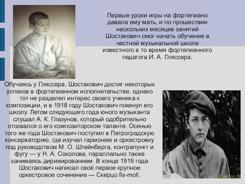 Обучаясь у Гляссера, Шостакович достиг некоторых успехов в фортепианном исполнительстве, однако тот не разделял интерес своего ученика к композиции, и в 1918 году Шостакович покинул его школу. Летом следующего года юного музыканта слушал А. К. Глазунов, который одобрительно отозвался о его композиторском таланте. Осенью того же года Шостакович поступил в Петроградскую консерваторию, где изучал гармонию и оркестровку под руководством М. О. Штейнберга, контрапункт и фугу — у Н. А. Соколова, параллельно также занимаясь дирижированием. В конце 1919 года Шостакович написал своё первое крупное оркестровое сочинение — Скерцо fis-moll.