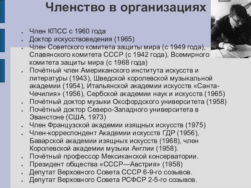 Почётный член Американского института искусств и литературы (1943), Шведской королевской музыкальной академии (1954), Итальянской академии искусств «Санта-Чечилия» (1956), Сербской академии наук и искусств (1965)