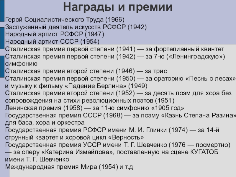 Сталинская премия первой степени (1950) — за ораторию «Песнь о лесах» и музыку к фильму «Падение Берлина» (1949)