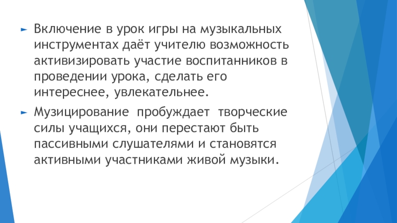 Слайд 8Включение в урок игры на музыкальных инструментах даёт учителю возможность активизировать