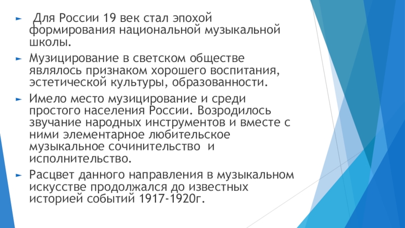 Расцвет данного направления в музыкальном искусстве продолжался до известных историей событий 1917-1920г.