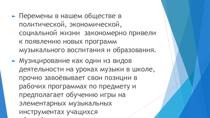 Музицирование как один из видов деятельности на уроках музыки в школе, прочно завоёвывает свои позиции в рабочих программах по предмету и предполагает обучению игры на элементарных музыкальных инструментах учащихся общеобразовательных школ.