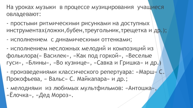 Слайд 10На уроках музыки в процессе музицирования учащиеся овладевают: