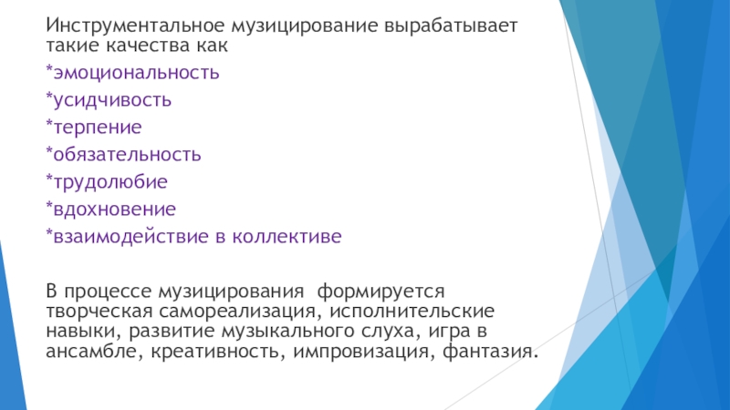 Слайд 11Инструментальное музицирование вырабатывает такие качества как