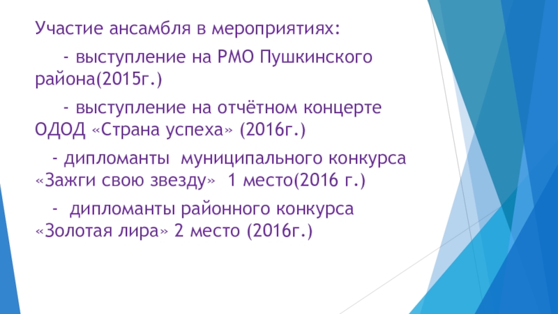 - дипломанты районного конкурса «Золотая лира» 2 место (2016г.)