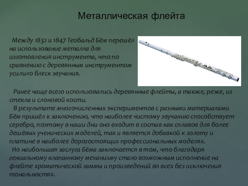 Между 1832 и 1847 Теобальд Бём перешёл на использование металла для изготовления инструмента, что по сравнению с деревянным инструментом усилило блеск звучания.