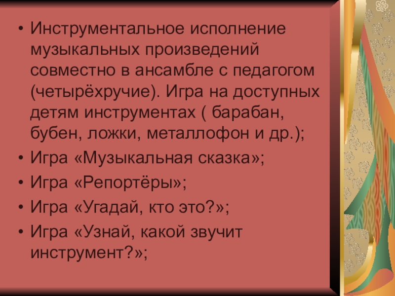 Слайд 9Инструментальное исполнение музыкальных произведений совместно в ансамбле с педагогом (четырёхручие). Игра