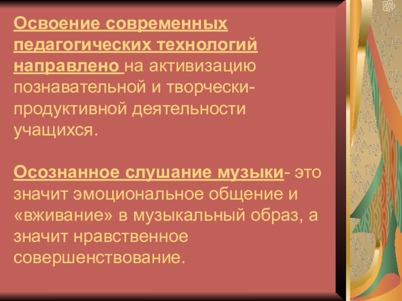 Осознанное слушание музыки- это значит эмоциональное общение и «вживание» в музыкальный образ, а значит нравственное совершенствование.