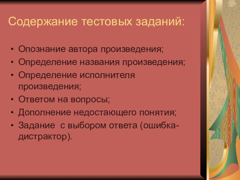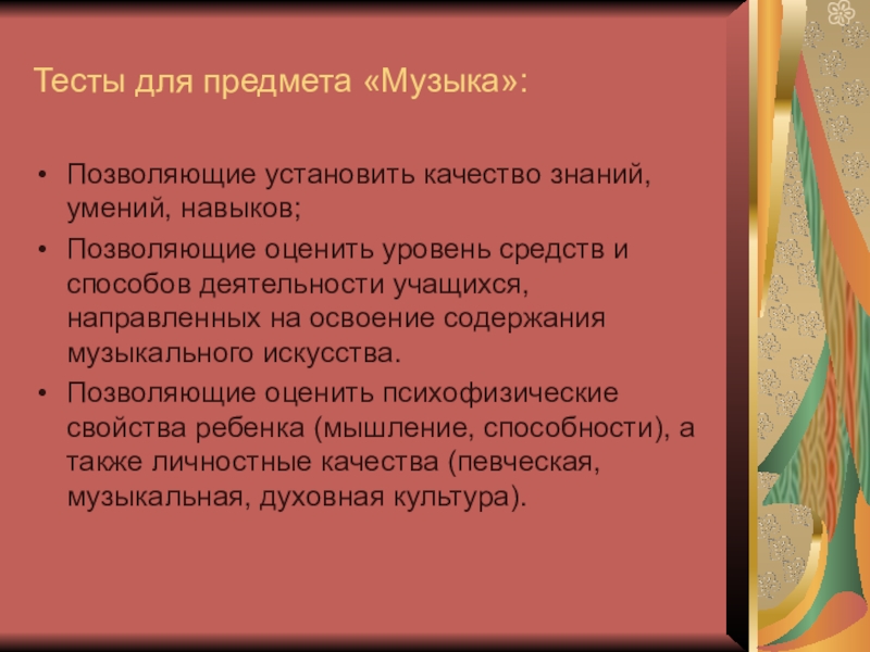Позволяющие оценить психофизические свойства ребенка (мышление, способности), а также личностные качества (певческая, музыкальная, духовная культура).