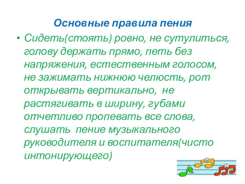 напряжения, естественным голосом, не зажимать нижнюю челюсть, рот открывать вертикально, не растягивать в ширину, губами отчетливо пропевать все слова, слушать пение музыкального руководителя и воспитателя(чисто интонирующего)