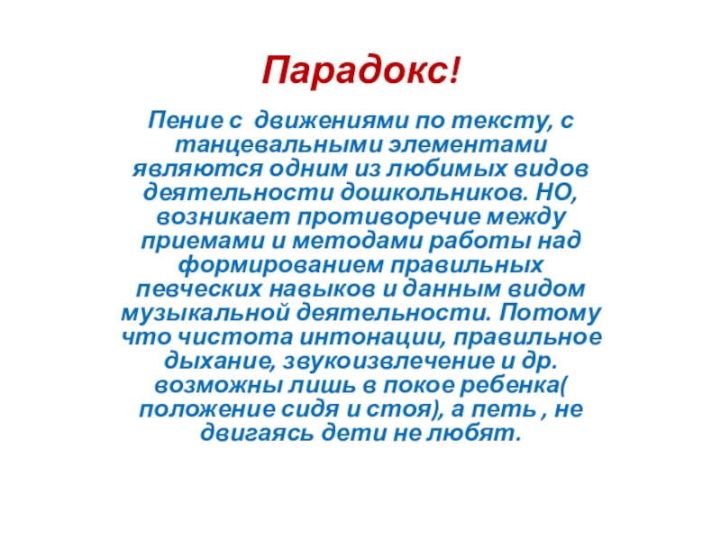 любимых видов деятельности дошкольников. НО, возникает противоречие между приемами и методами работы над формированием правильных певческих навыков и данным видом музыкальной деятельности. Потому что чистота интонации, правильное дыхание, звукоизвлечение и др. возможны лишь в покое ребенка( положение сидя и стоя), а петь , не двигаясь дети не любят.