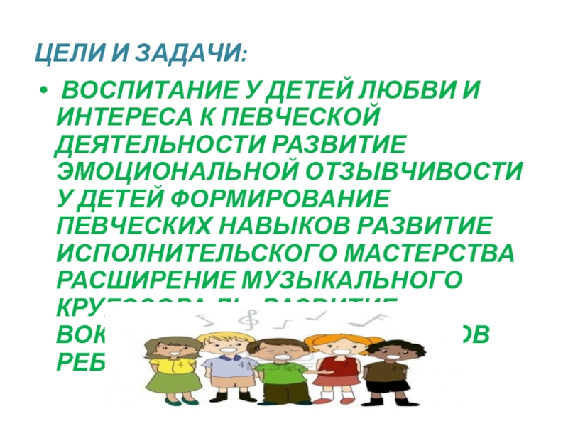 ДЕЯТЕЛЬНОСТИ РАЗВИТИЕ ЭМОЦИОНАЛЬНОЙ ОТЗЫВЧИВОСТИ У ДЕТЕЙ ФОРМИРОВАНИЕ ПЕВЧЕСКИХ НАВЫКОВ РАЗВИТИЕ ИСПОЛНИТЕЛЬСКОГО МАСТЕРСТВА РАСШИРЕНИЕ МУЗЫКАЛЬНОГО КРУГОЗОРА ЛЬ: РАЗВИТИЕ ВОКАЛЬНО - ХОРОВЫХ НАВЫКОВ РЕБЕНКА