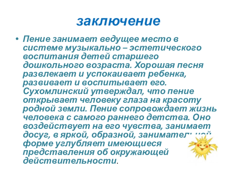 старшего дошкольного возраста. Хорошая песня развлекает и успокаивает ребенка, развивает и воспитывает его. Сухомлинский утверждал, что пение открывает человеку глаза на красоту родной земли. Пение сопровождает жизнь человека с самого раннего детства. Оно воздействует на его чувства, занимает досуг, в яркой, образной, занимательной форме углубляет имеющиеся представления об окружающей действительности.