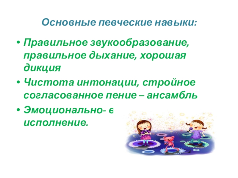 Правильное звукообразование, правильное дыхание, хорошая дикция