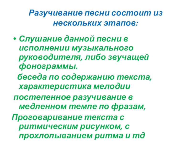 Слайд 8Разучивание песни состоит из нескольких этапов: