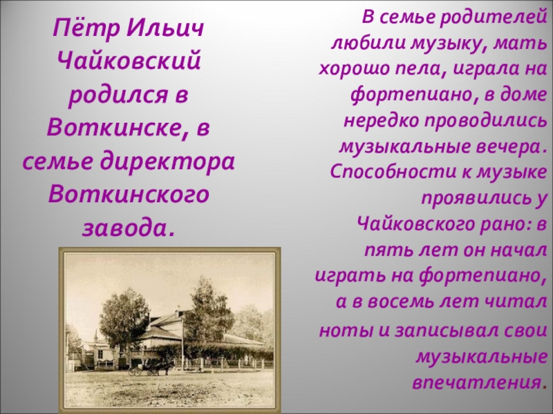 Пётр Ильич Чайковский родился в Воткинске, в семье директора Воткинского завода.В семье родителей любили музыку, мать хорошо пела, играла на фортепиано, в доме нередко проводились музыкальные вечера. Способности к музыке проявились у Чайковского рано: в пять