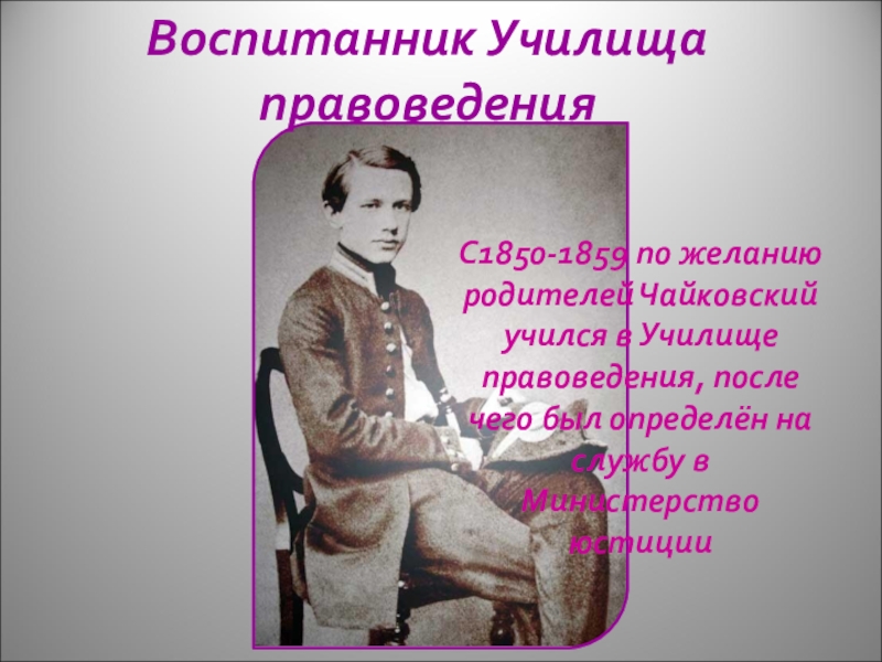 Воспитанник Училища правоведения С1850-1859 по желанию родителей Чайковский учился в Училище правоведения, после чего был определён на