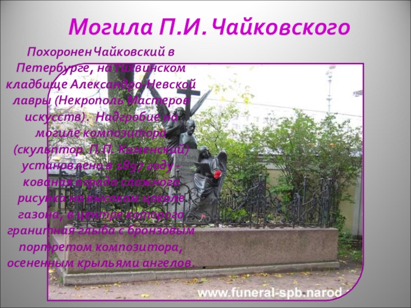 Могила П.И. ЧайковскогоПохоронен Чайковский в Петербурге, на Тихвинском кладбище Александро-Невской лавры (Некрополь Мастеров искусств). Надгробие на могиле
