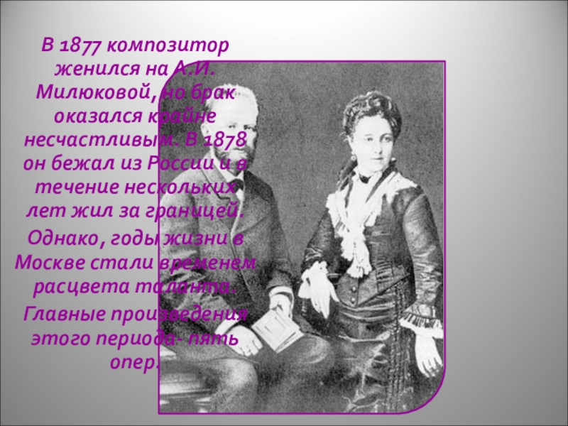 Слайд 10В 1877 композитор женился на А.И.Милюковой, но брак оказался крайне несчастливым.