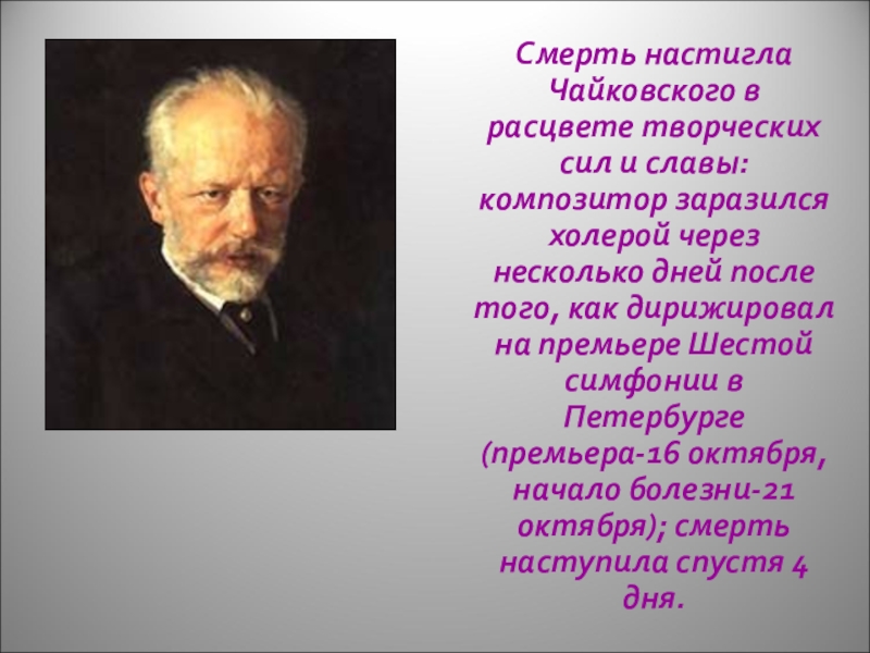 Слайд 18Смерть настигла Чайковского в расцвете творческих сил и славы: композитор заразился