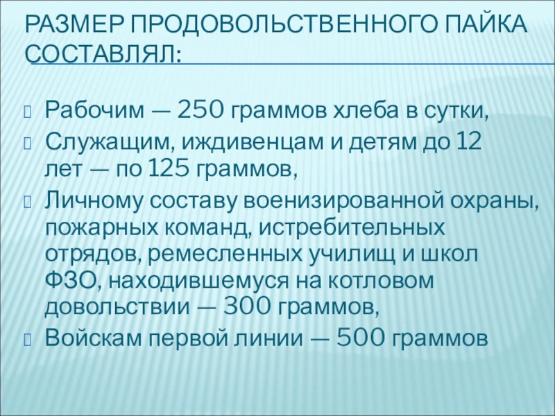 Слайд 13РАЗМЕР ПРОДОВОЛЬСТВЕННОГО ПАЙКА СОСТАВЛЯЛ: