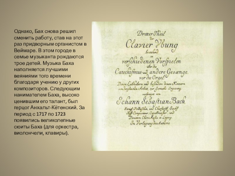 органистом в Веймаре. В этом городе в семье музыканта рождаются трое детей. Музыка Баха наполняется лучшими веяниями того времени благодаря учению у других композиторов. Следующим нанимателем Баха, высоко ценившим его талант, был герцог Анхальт-Кётенский. За период с 1717 по 1723 появились великолепные сюиты Баха (для оркестра, виолончели, клавиры).