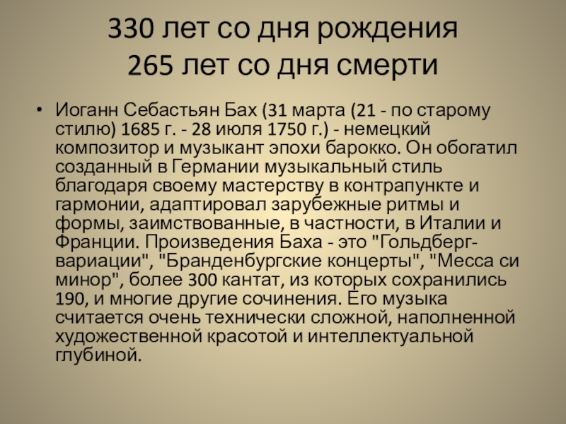 (31 марта (21 - по старому стилю) 1685 г. - 28 июля 1750 г.) - немецкий композитор и музыкант эпохи барокко. Он обогатил созданный в Германии музыкальный стиль благодаря своему мастерству в контрапункте и гармонии, адаптировал зарубежные ритмы и формы, заимствованные, в частности, в Италии и Франции. Произведения Баха - это "Гольдберг-вариации", "Бранденбургские концерты", "Месса си минор", более 300 кантат, из которых сохранились 190, и многие другие сочинения. Его музыка считается очень технически сложной, наполненной художественной красотой и интеллектуальной глубиной.