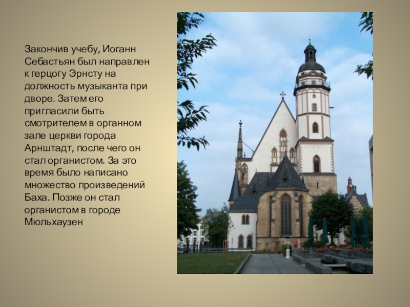 музыканта при дворе. Затем его пригласили быть смотрителем в органном зале церкви города Арнштадт, после чего он стал органистом. За это время было написано множество произведений Баха. Позже он стал органистом в городе Мюльхаузен