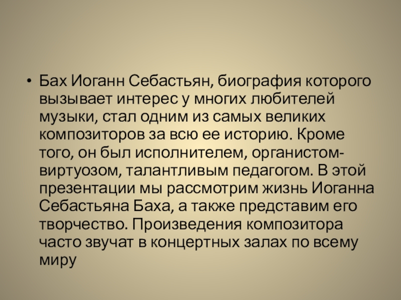 стал одним из самых великих композиторов за всю ее историю. Кроме того, он был исполнителем, органистом-виртуозом, талантливым педагогом. В этой презентации мы рассмотрим жизнь Иоганна Себастьяна Баха, а также представим его творчество. Произведения композитора часто звучат в концертных залах по всему миру