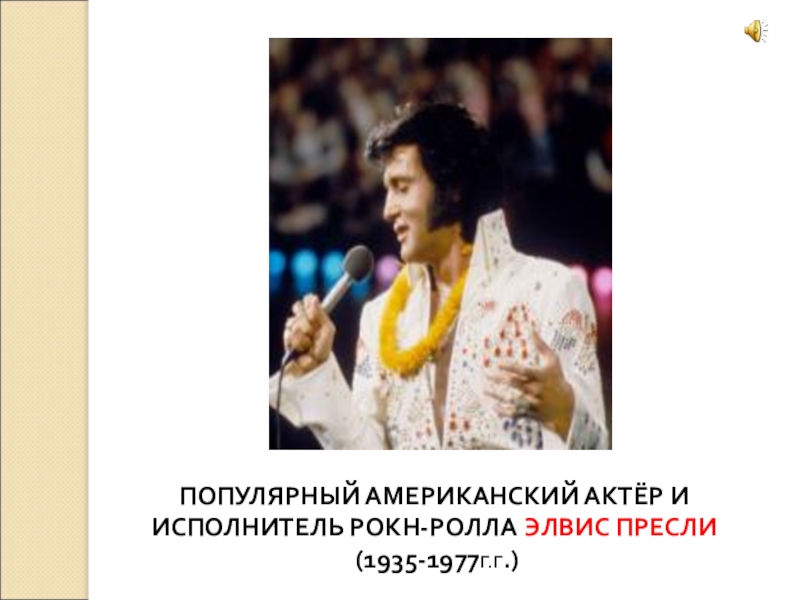 Слайд 6ПОПУЛЯРНЫЙ АМЕРИКАНСКИЙ АКТЁР И ИСПОЛНИТЕЛЬ РОКН-РОЛЛА ЭЛВИС ПРЕСЛИ