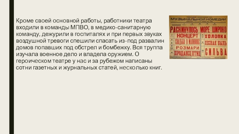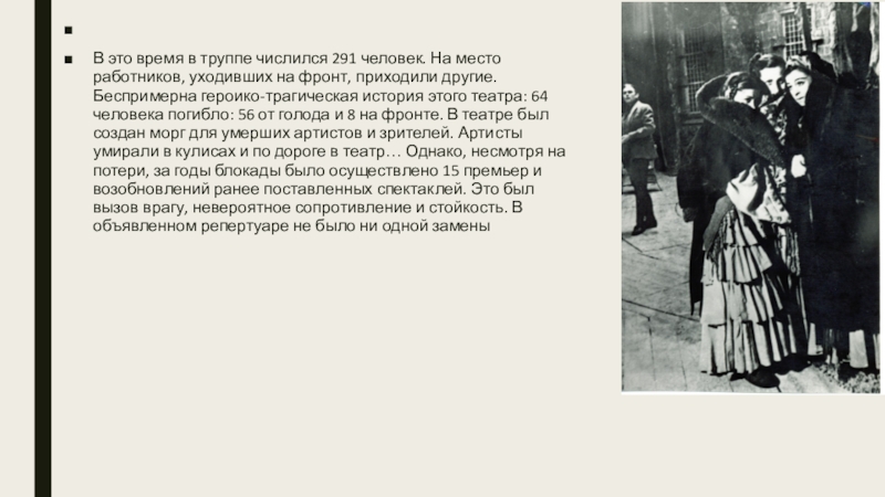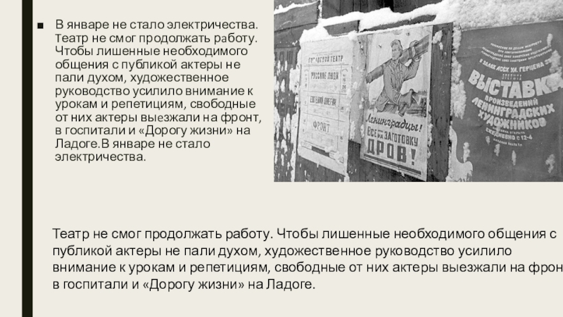 Театр не смог продолжать работу. Чтобы лишенные необходимого общения с публикой актеры не пали духом, художественное руководство усилило внимание к урокам и репетициям, свободные от них актеры выезжали на фронт, в госпитали и «Дорогу жизни» на Ладоге.