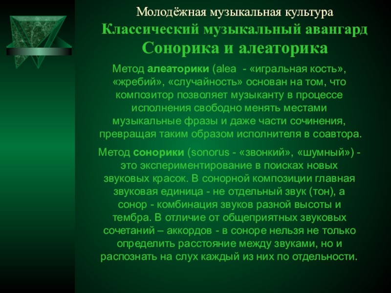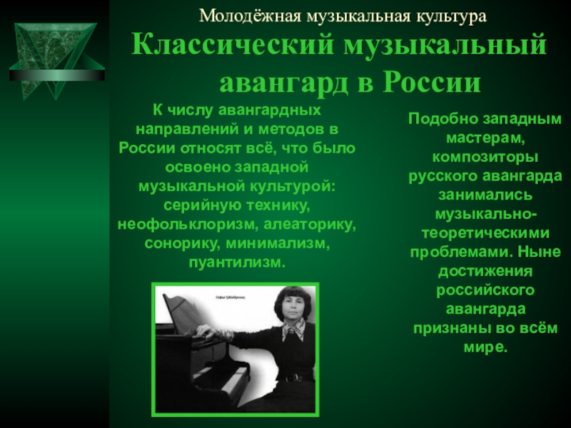 Подобно западным мастерам, композиторы русского авангарда занимались музыкально-теоретическими проблемами. Ныне достижения российского авангарда признаны во всём мире.