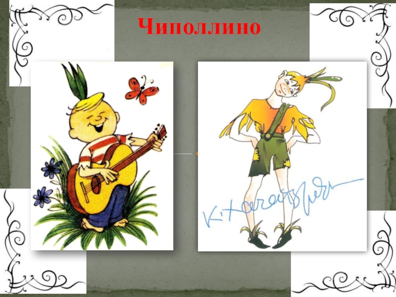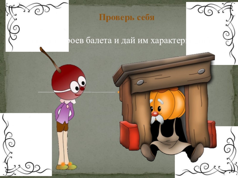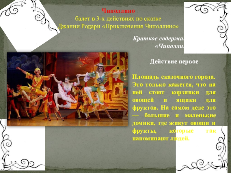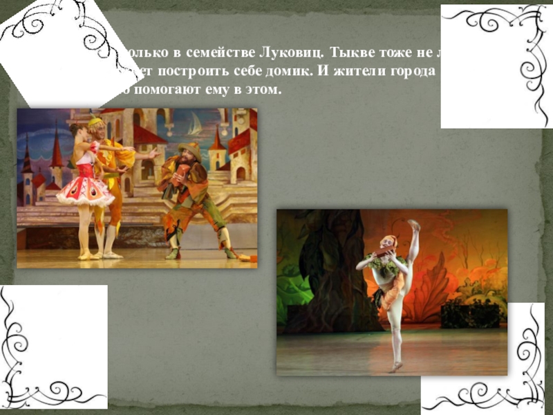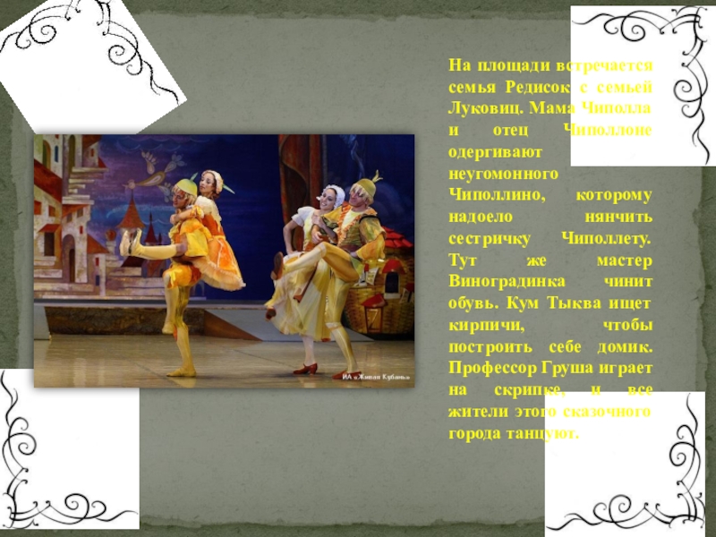 отец Чиполлоне одергивают неугомонного Чиполлино, которому надоело нянчить сестричку Чиполлету. Тут же мастер Виноградинка чинит обувь. Кум Тыква ищет кирпичи, чтобы построить себе домик. Профессор Груша играет на скрипке, и все жители этого сказочного города танцуют.