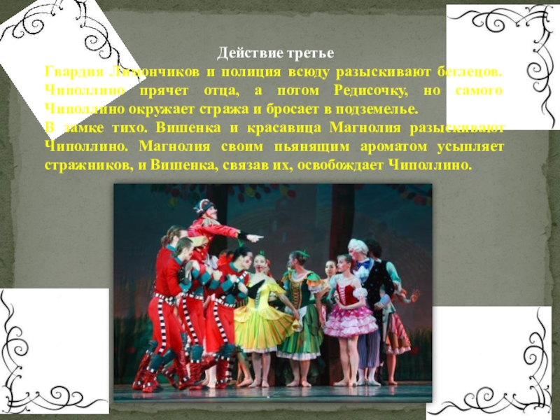 В замке тихо. Вишенка и красавица Магнолия разыскивают Чиполлино. Магнолия своим пьянящим ароматом усыпляет стражников, и Вишенка, связав их, освобождает Чиполлино.
