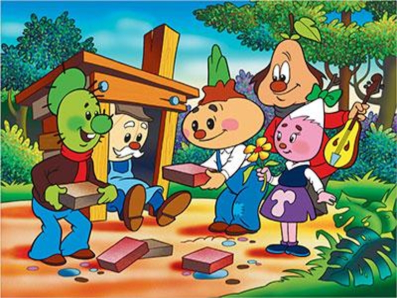 он сам не может построить себе домик. И жители города во главе с Чиполлино помогают ему в этом.