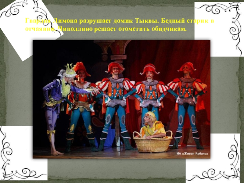 Слайд 17Гвардия Лимона разрушает домик Тыквы. Бедный старик в отчаянии. Чиполлино решает