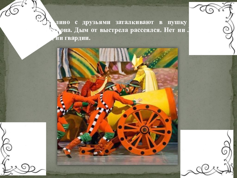 Слайд 22Но Чиполлино с друзьями заталкивают в пушку самого принца Лимона. Дым
