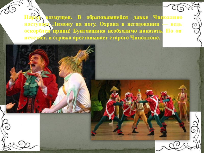 Слайд 14Народ возмущен. В образовавшейся давке Чиполлино наступает Лимону на ногу. Охрана
