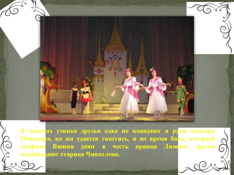 но им удается спастись, и во время бала, который графини Вишни дают в честь принца Лимона, друзья освобождают старика Чиполлоне.