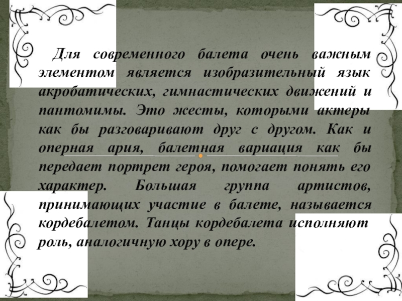 движений и пантомимы. Это жесты, которыми актеры как бы разговаривают друг с другом. Как и оперная ария, балетная вариация как бы передает портрет героя, помогает понять его характер. Большая группа артистов, принимающих участие в балете, называется кордебалетом. Танцы кордебалета исполняют роль, аналогичную хору в опере.