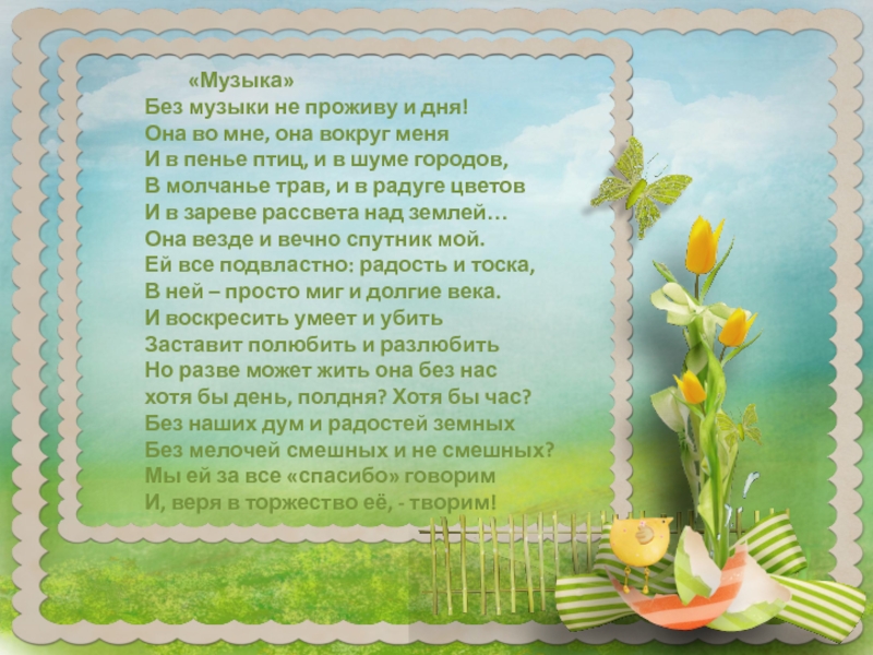 «Музыка»Без музыки не проживу и дня!Она во мне, она вокруг меняИ в пенье птиц, и в шуме