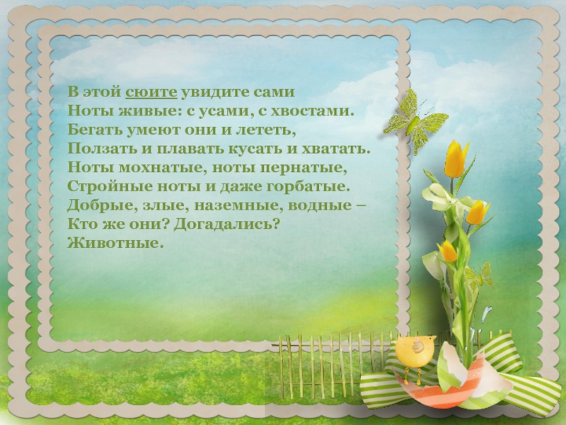 В этой сюите увидите самиНоты живые: с усами, с хвостами.Бегать умеют они и лететь,Ползать и плавать кусать