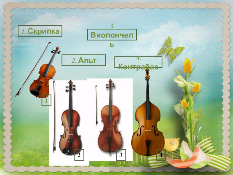 12341. Скрипка2. Альт3. Виолончель4. Контрабас
