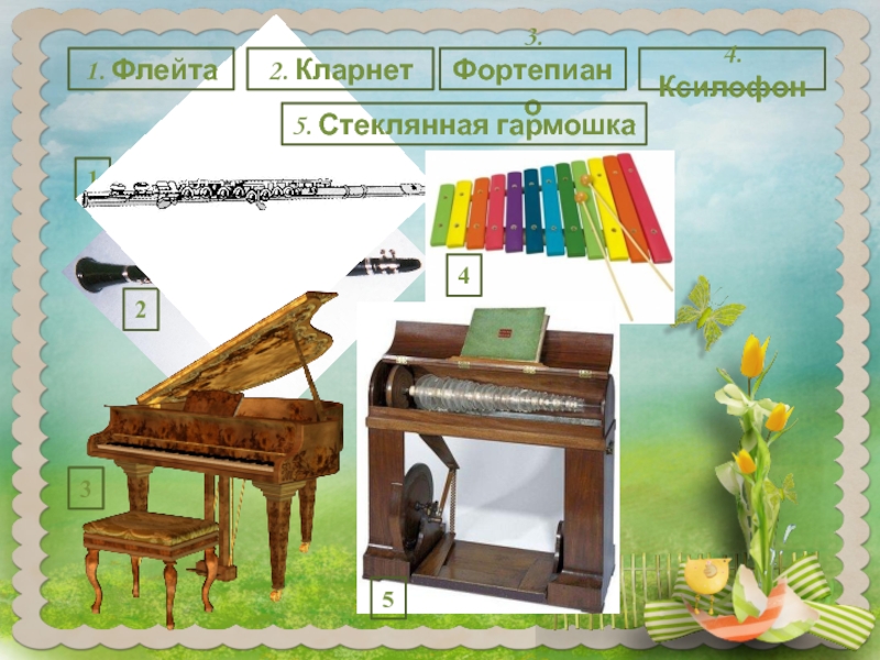 121. Флейта2. Кларнет3. Фортепиано4. Ксилофон4355. Стеклянная гармошка