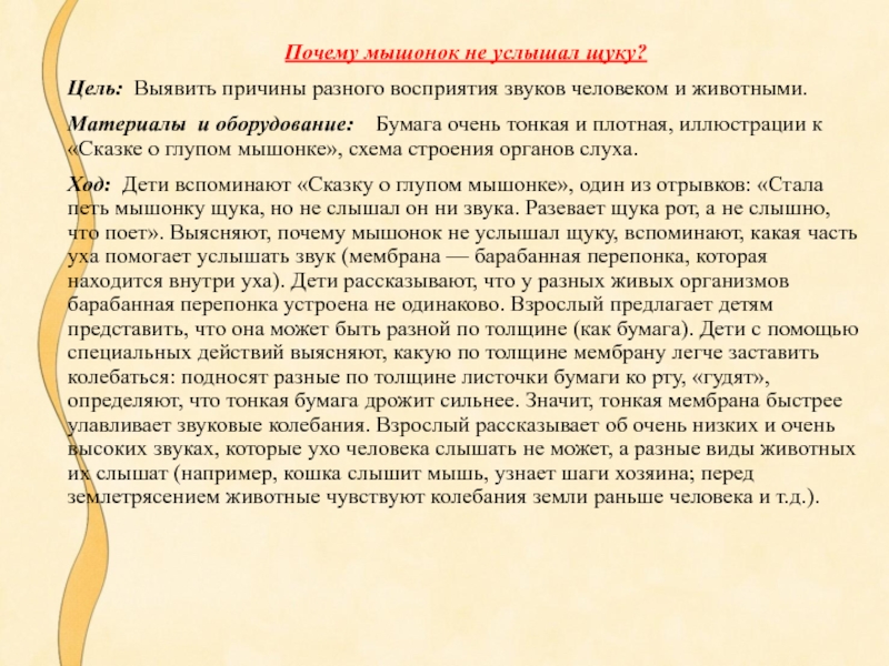 Ход: Дети вспоминают «Сказку о глупом мышонке», один из отрывков: «Стала петь мышонку щука, но не слышал он ни звука. Разевает щука рот, а не слышно, что поет». Выясняют, почему мышонок не услышал щуку, вспоминают, какая часть уха помогает услышать звук (мембрана — барабанная перепонка, которая находится внутри уха). Дети рассказывают, что у разных живых организмов барабанная перепонка устроена не одинаково. Взрослый предлагает детям представить, что она может быть разной по толщине (как бумага). Дети с помощью специальных действий выясняют, какую по толщине мембрану легче заставить колебаться: подносят разные по толщине листочки бумаги ко рту, «гудят», определяют, что тонкая бумага дрожит сильнее. Значит, тонкая мембрана быстрее улавливает звуковые колебания. Взрослый рассказывает об очень низких и очень высоких звуках, которые ухо человека слышать не может, а разные виды животных их слышат (например, кошка слышит мышь, узнает шаги хозяина; перед землетрясением животные чувствуют колебания земли раньше человека и т.д.).